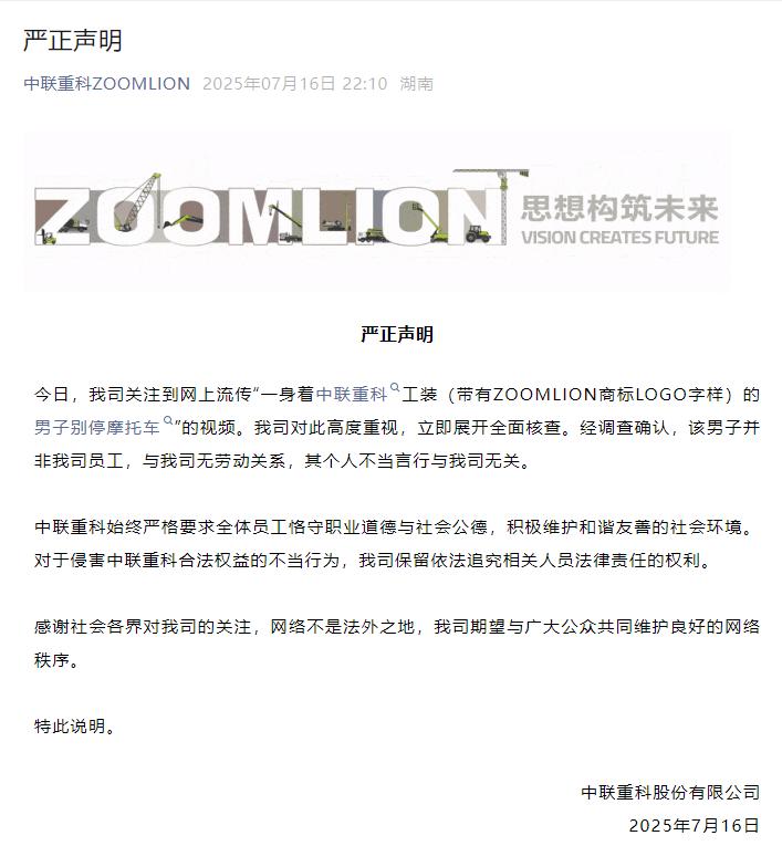 中聯(lián)重科:別停摩托車的男子非公司員工,其個人言行與公司無關(guān)
