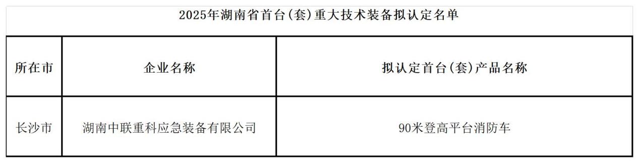 中聯(lián)重科90米登高平臺(tái)消防車(chē)入選《2025湖南省首臺(tái)(套)重大技術(shù)裝備擬認(rèn)定名單》