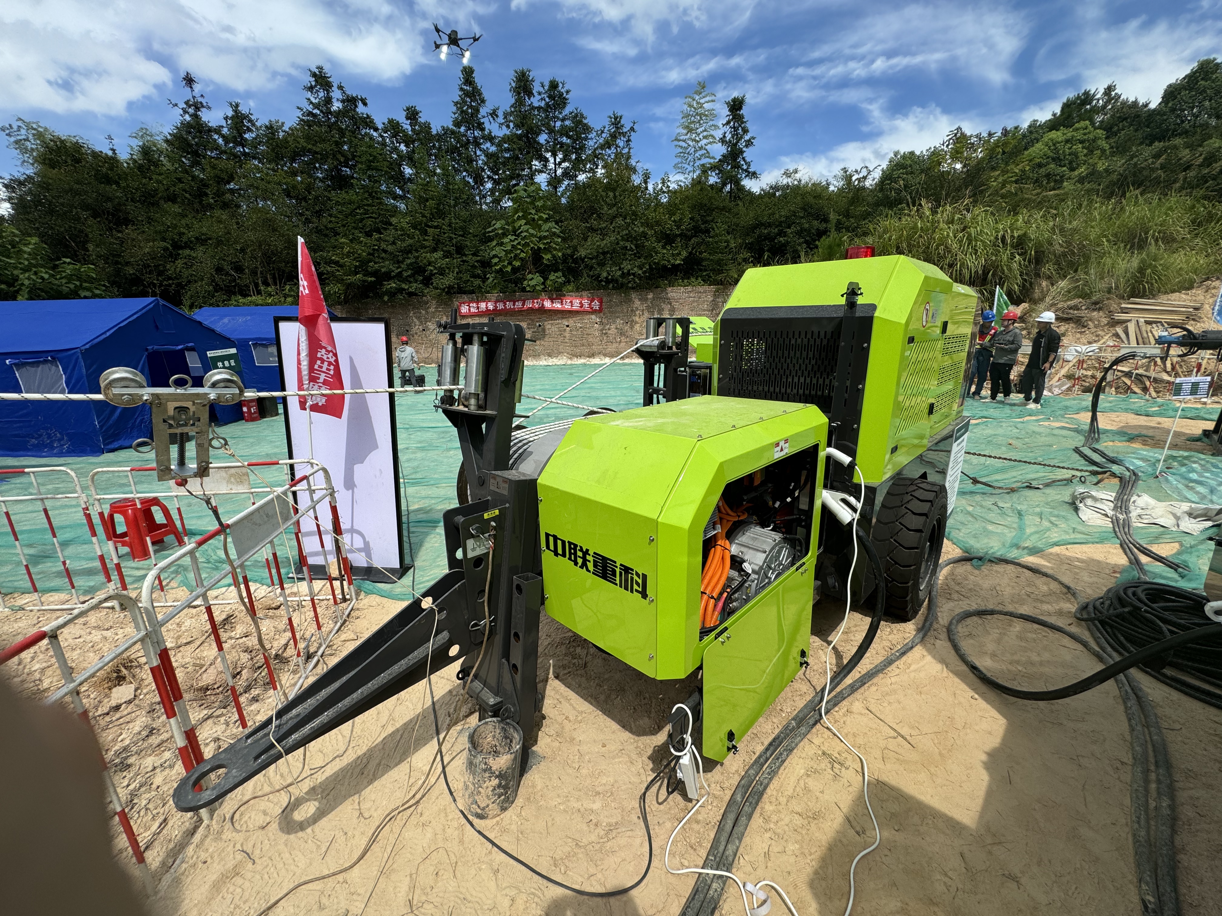 在現(xiàn)場,中聯(lián)重科應(yīng)急裝備公司打造的新能源牽張設(shè)備徹底改變了傳統(tǒng)燃油動力模式,以電驅(qū)系統(tǒng)全面替代燃油驅(qū)動,實現(xiàn)施工過程零排放、零污染,在節(jié)能、降噪、高效及智能方面表現(xiàn)卓越。新能源張力機可高效回收牽引動能,不僅實現(xiàn)電池能量自給自足,還可將富余電能用于設(shè)備間共享或外放電,支持為系留無人機系統(tǒng)供電,實現(xiàn)夜間照明等應(yīng)用。新能源牽引機采用“電驅(qū)+增程”方案,電量不足時增程器自動啟動,保障持續(xù)作業(yè),相較于傳統(tǒng)燃油牽引機,節(jié)能率達50%以上。