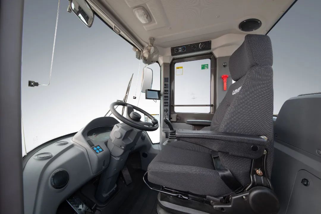 駕駛室前玻璃采用雙曲率大開口夾層安全玻璃,滿足駕乘人員對(duì)于周邊及工作裝置視野要求;標(biāo)配氣懸浮座椅,雙滑軌調(diào)節(jié),135°后傾角度,提升駕乘舒適性。