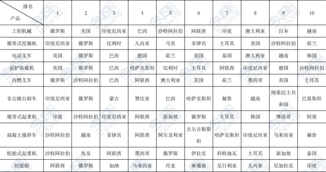 表1 2025年1-9月主要工程機(jī)械產(chǎn)品出口金額排名前十位國家和地區(qū)