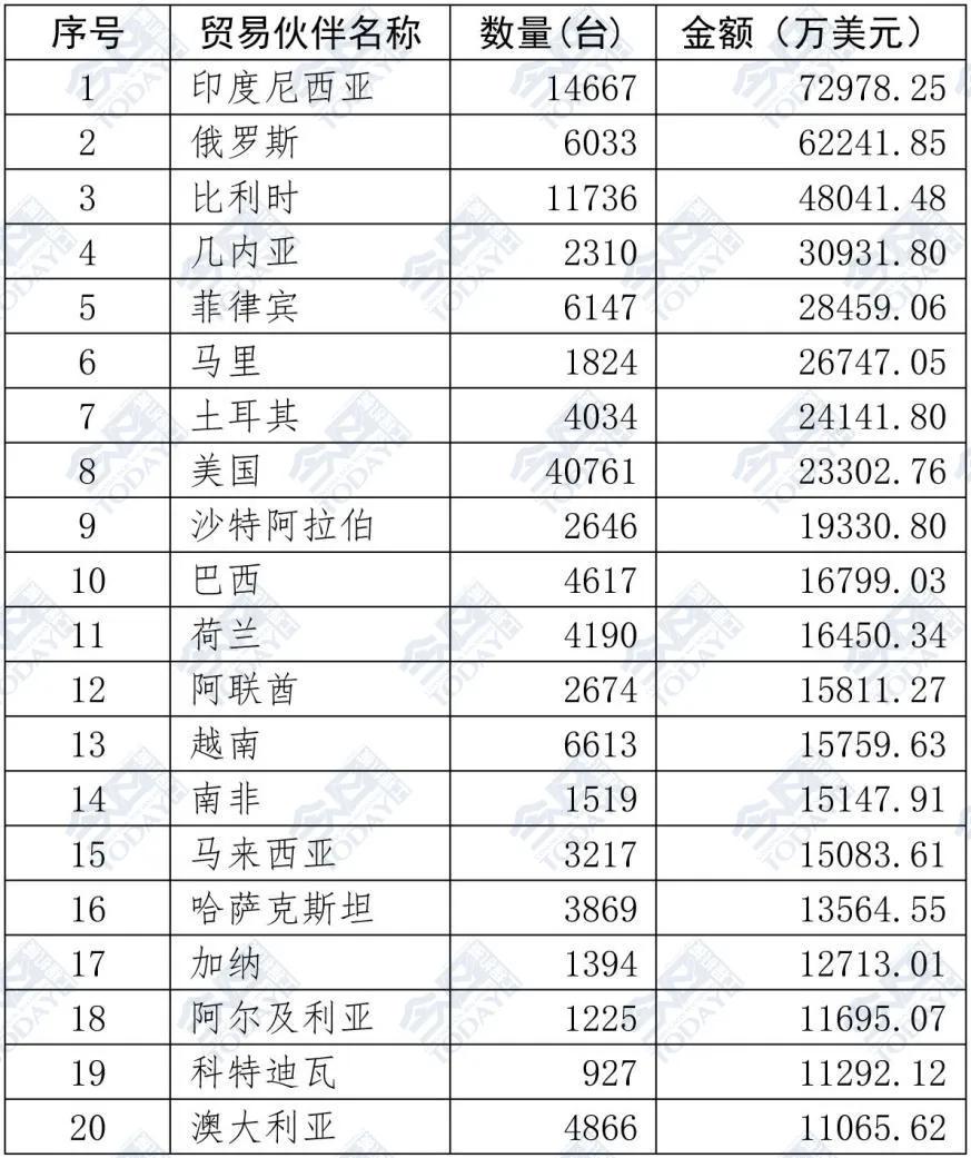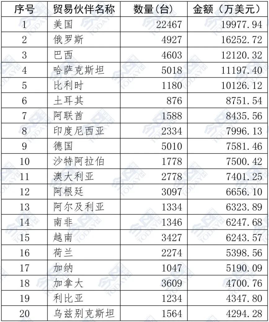 表2 2025年1—9月挖掘機(jī)出口額排名前二十位國家和地區(qū)