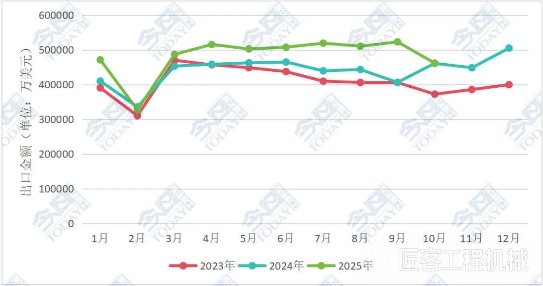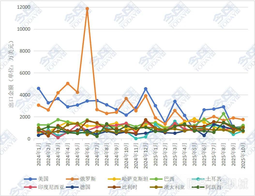 從環(huán)比情況來看2025年10月挖掘機出口情況,在出口額前十的國家中,僅印度尼西亞、俄羅斯、美國、巴西四國實現(xiàn)環(huán)比增長。其中美國增幅超40%;對俄羅斯出口額連續(xù)兩個月大幅增長,并于10月首次突破1.5億美元,創(chuàng)近兩年挖掘機單月出口國別最高紀錄;對印度尼西亞出口額則突破1億美元,創(chuàng)該國2025年內(nèi)月度出口新高。我國挖掘機出口額走勢具體情況詳見圖3。
