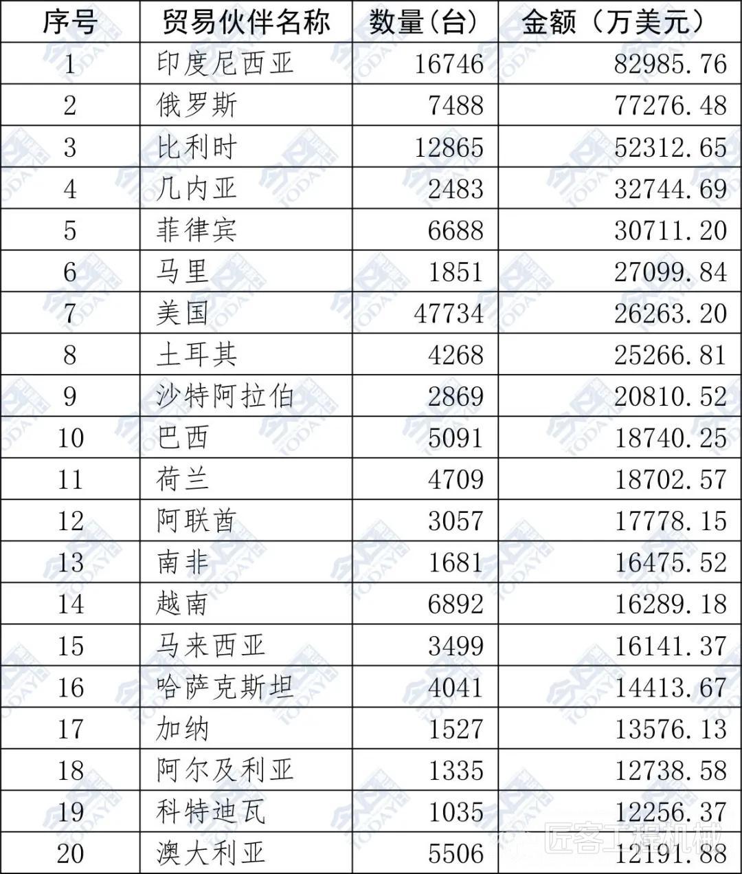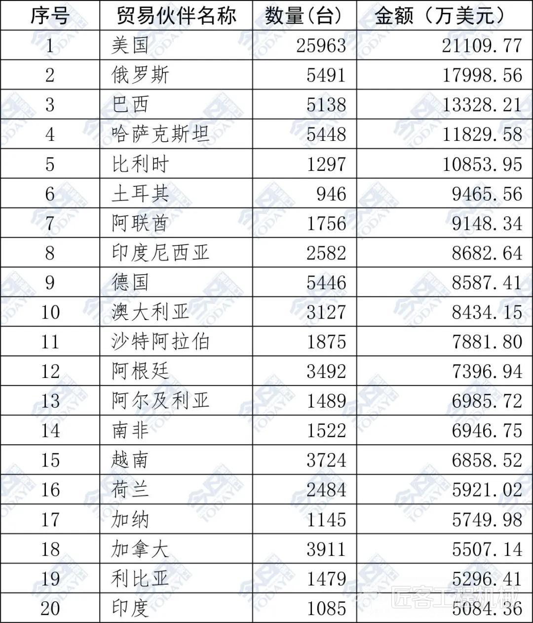 表2 2025年1—10月挖掘機出口額排名前二十位國家和地區(qū)