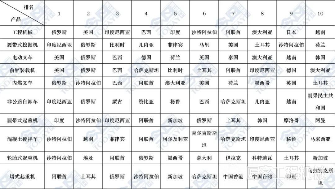 表1 2025年1-10月主要工程機械產(chǎn)品出口金額排名前十位國家和地區(qū)