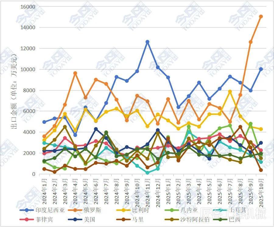 從2025年1—10月主要工程機械產(chǎn)品進出口貿(mào)易情況來看,對俄羅斯、美國、印度尼西亞出口金額排名位列前三。