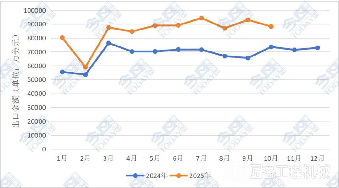 10月挖掘機出口同比上升19.88%,2025年1—10月累計出口同比增長26.19%
