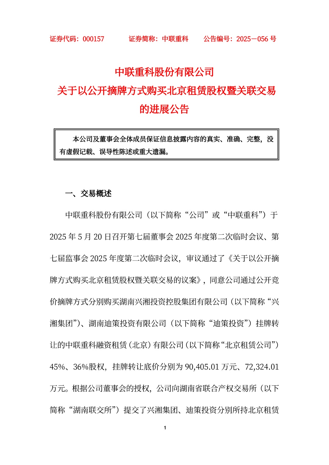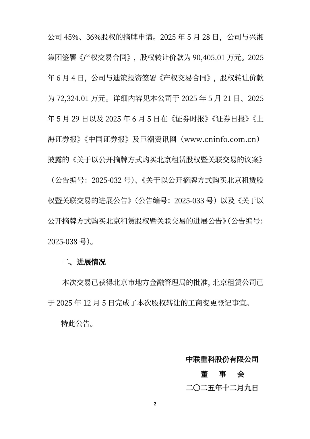 中聯(lián)重科股份有限公司(以下簡稱“公司”或“中聯(lián)重科”)于2025 年 5 月 20 日召開第七屆董事會 2025 年度第二次臨時會議、第七屆監(jiān)事會 2025 年度第二次臨時會議,審議通過了《關(guān)于以公開摘牌方式購買北京租賃股權(quán)暨關(guān)聯(lián)交易的議案》,同意公司通過公開競價摘牌方式分別購買湖南興湘投資控股集團(tuán)有限公司(以下簡稱“興湘集團(tuán)”)、湖南迪策投資有限公司(以下簡稱“迪策投資”)掛牌轉(zhuǎn)讓的中聯(lián)重科融資租賃(北京)有限公司(以下簡稱“北京租賃公司”)45%、36%股權(quán),掛牌轉(zhuǎn)讓底價分別為 90405.01 萬元、72324.01萬元。根據(jù)公司董事會的授權(quán),公司向湖南省聯(lián)合產(chǎn)權(quán)交易所(以下簡稱“湖南聯(lián)交所”)提交了興湘集團(tuán)、迪策投資分別所持北京租賃公司 45%、36%股權(quán)的摘牌申請。2025 年 5 月 28 日,公司與興湘集團(tuán)簽署《產(chǎn)權(quán)交易合同》,股權(quán)轉(zhuǎn)讓價款為 90405.01 萬元。2025年 6 月 4 日,公司與迪策投資簽署《產(chǎn)權(quán)交易合同》,股權(quán)轉(zhuǎn)讓價款為 72324.01 萬元。