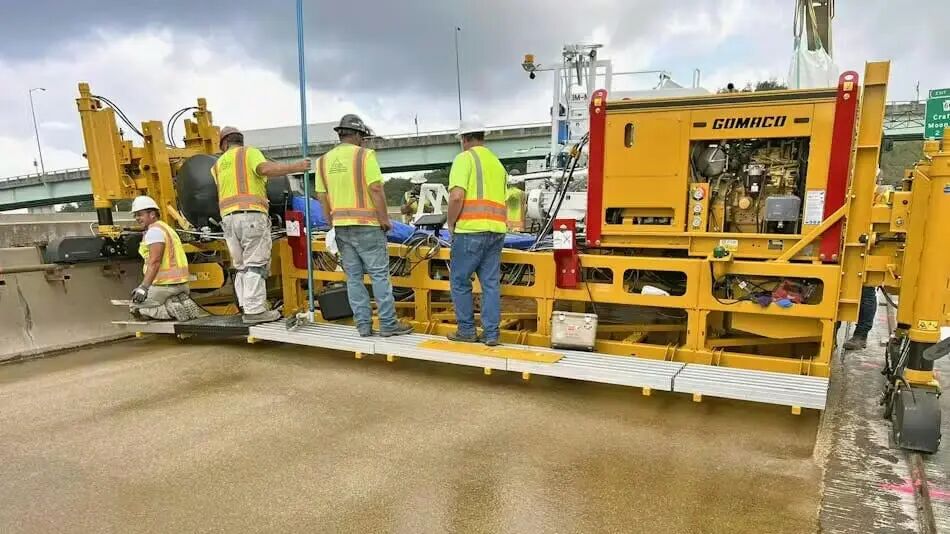 如果你從事混凝土攤鋪業(yè)務(wù),你大概率已經(jīng)熟悉Gomaco。現(xiàn)在可能更該認識它的新產(chǎn)品 Polymer Paver(聚合物攤鋪機),面向超薄罩面(ultra-thin overlays)。該機可攤鋪15.24—76.2cm寬的罩面;鋼結(jié)構(gòu)框架為全焊接分段并用螺栓連接,有利于寬度調(diào)整;攤鋪底板分段與框架一致,設(shè)備可擴展而無需完全重構(gòu)。振動來自分段旋轉(zhuǎn)偏心機構(gòu),采用球軸承支撐;振動啟停與設(shè)備移動聯(lián)動,以減少表面不一致。送料采用雙驅(qū)動22.86cm可變速螺旋分料器。控制系統(tǒng)使用Gomaco的G+ 系統(tǒng)進行高程與轉(zhuǎn)向控制,并配備25.4cm彩屏。