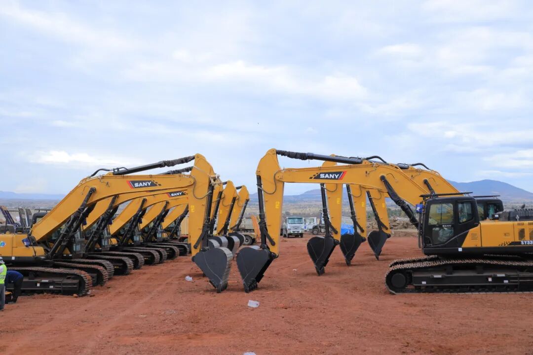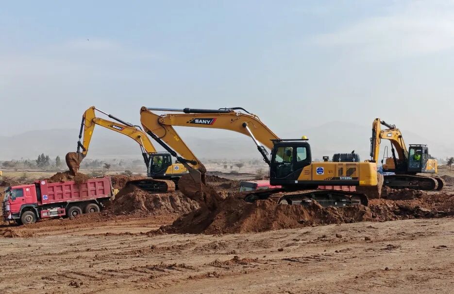 近日,10臺三一SY335C挖掘機順利運抵埃塞俄比亞比紹夫圖國際機場項目現(xiàn)場,正式交付中交一公局埃塞新機場項目。