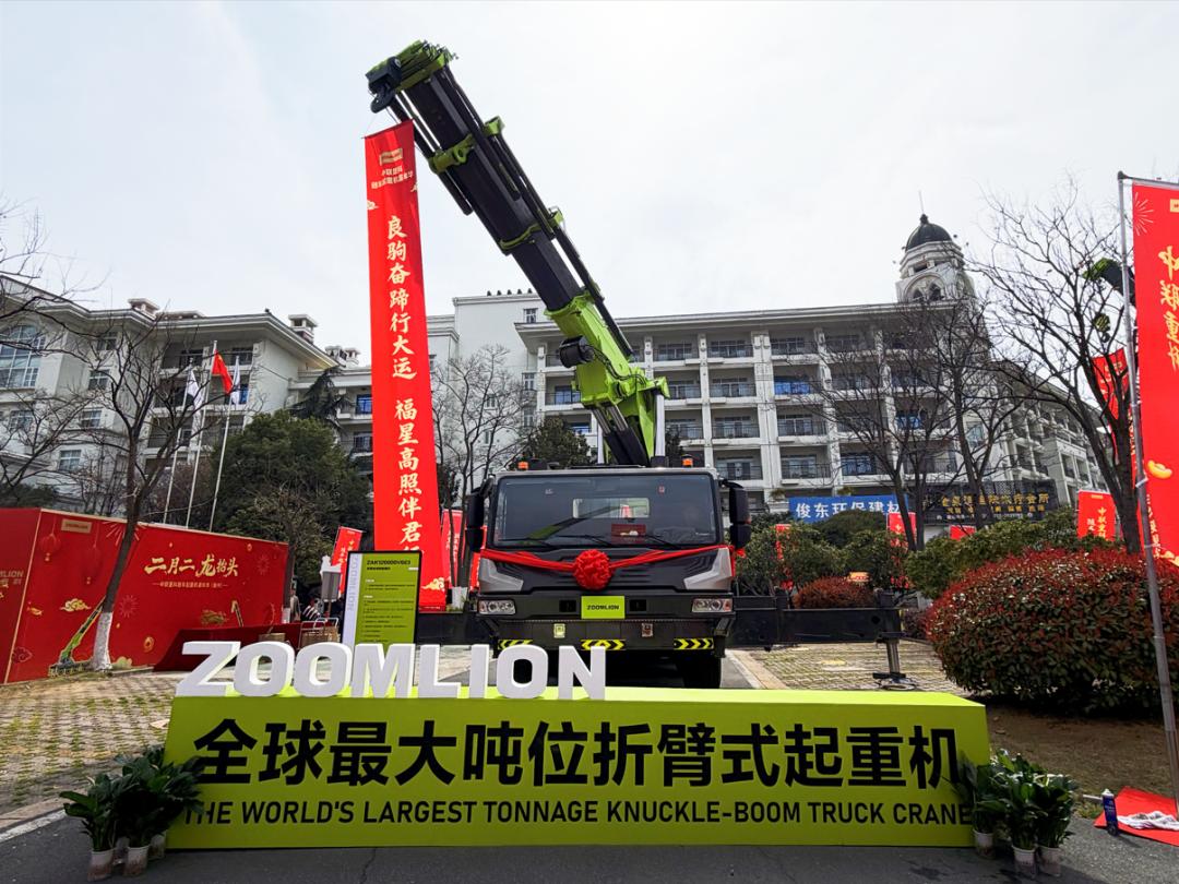 活動現場,8至16噸全系列直臂隨車起重機整齊列陣、吊臂擎天。這些產品憑借強悍的性能表現,可充分滿足全球客戶多樣化的工況作業需求。尤為吸睛的是,全球最大噸位折臂式起重機也在活動中驚艷亮相。該產品搭載行業首創的五橋全地面底盤,支持6種轉向模式,起重力矩與最大推舉能力均穩居行業首位,可精準適配低矮廠房內大型設備的搬運與安裝場景,破解特殊場景作業難題。